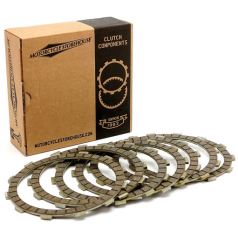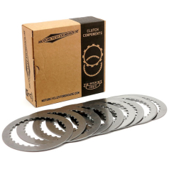 High Performance kit with 15% increased clutch surface. Set of nine friction plates with tempered steel cores, eight steel drive plates and 15% stronger-than-stock Heavy-Duty diaphragm clutch spring. Install without stock riveted double separator plate