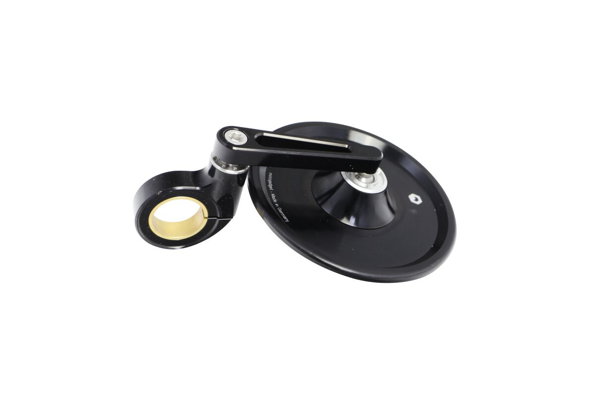 The mirror body, mirror arm and the clamp for the handlebar end are milled from solid aluminium on CNC machines and anodized to a high quality. All screws are made of stainless steel. The precise ball joint allows the mirror to be adjusted comfortably and very stably. Glass breakage or glass falling out is simply not possible!