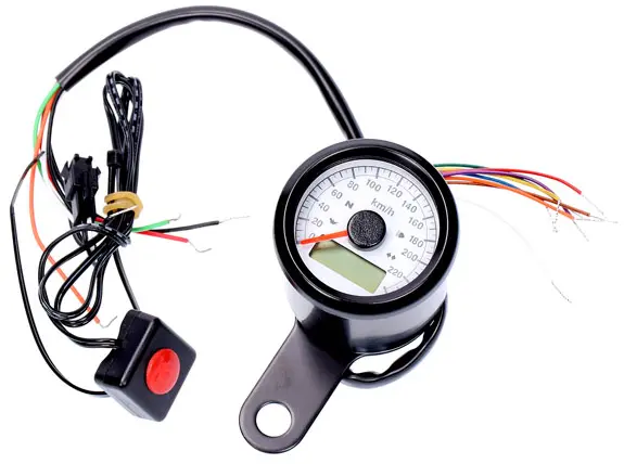 Vit frontplatta med svart hölje. 240km/h LED-belyst front med indikatorer för helljus, neutral, oljetryck och blinkers. Fjärrstyrd tryckknappsomkopplare för kalibrering och växling mellan vägmätaren och den dubbla trippmätaren på LCD-skärmen. Komplett med monteringsfäste och universell styrklämma som möjliggör installation på 7/8″ (22mm) till 1-1/4″ (32mm) stänger. Ledningarna är färgkodade och speedo levereras med installationsanvisningar. Ca. mått: 48mm x 51mm hög.