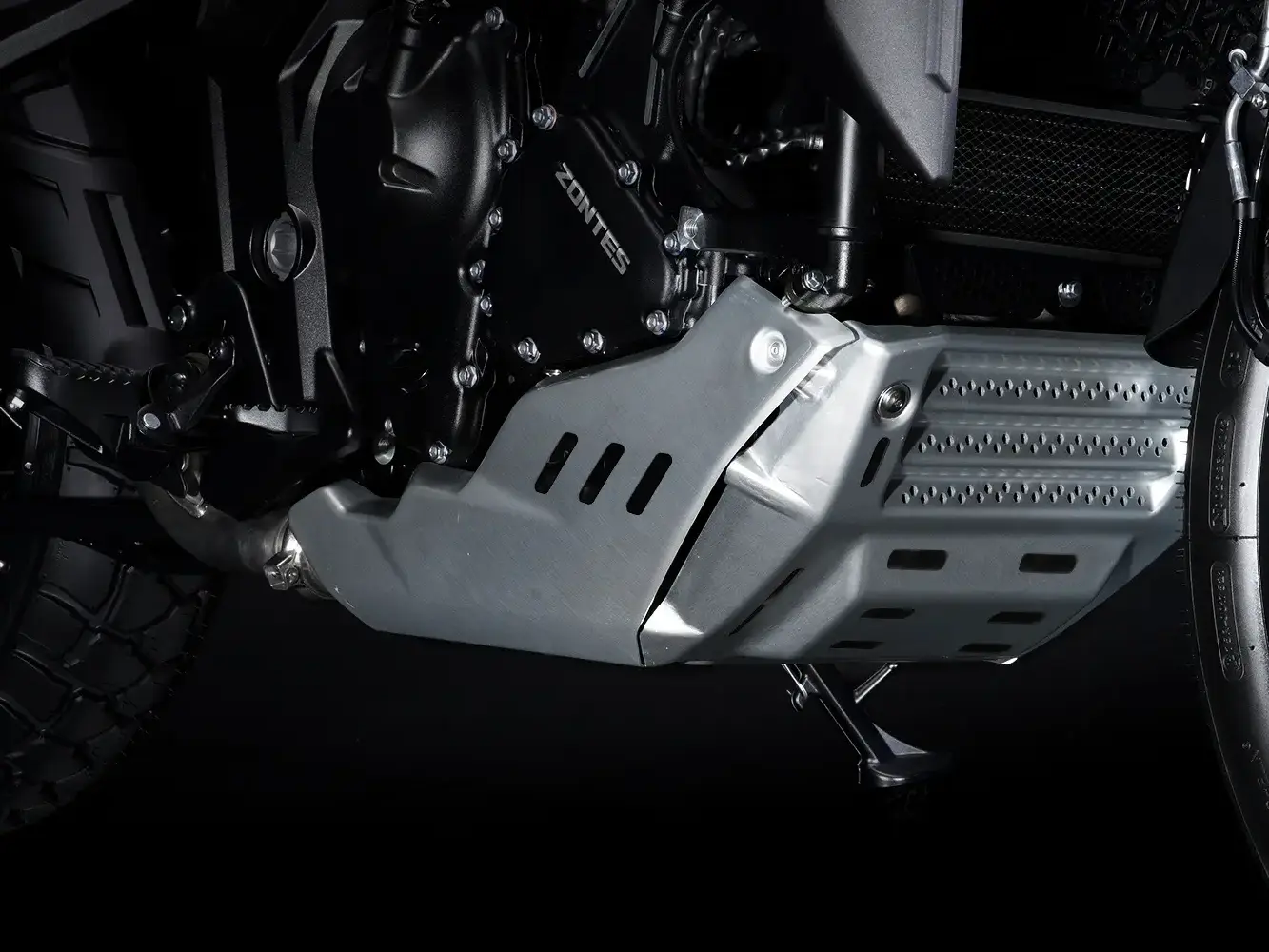 Zontes 703F Adventure är en mångsidig motorcykel designad för både väg och terräng, utrustad med 19-tums framhjul och 17-tums bakhjul för optimal prestanda.